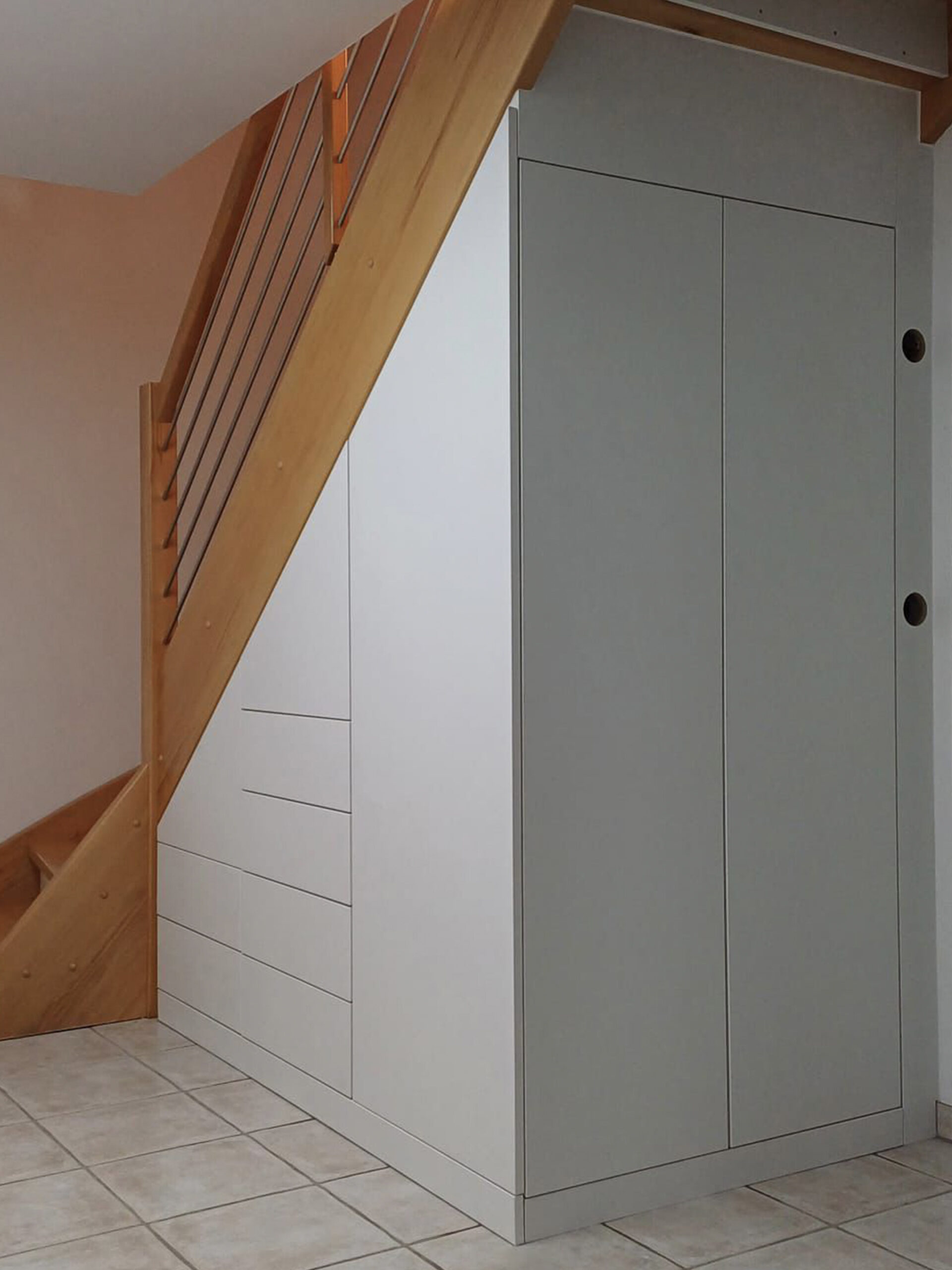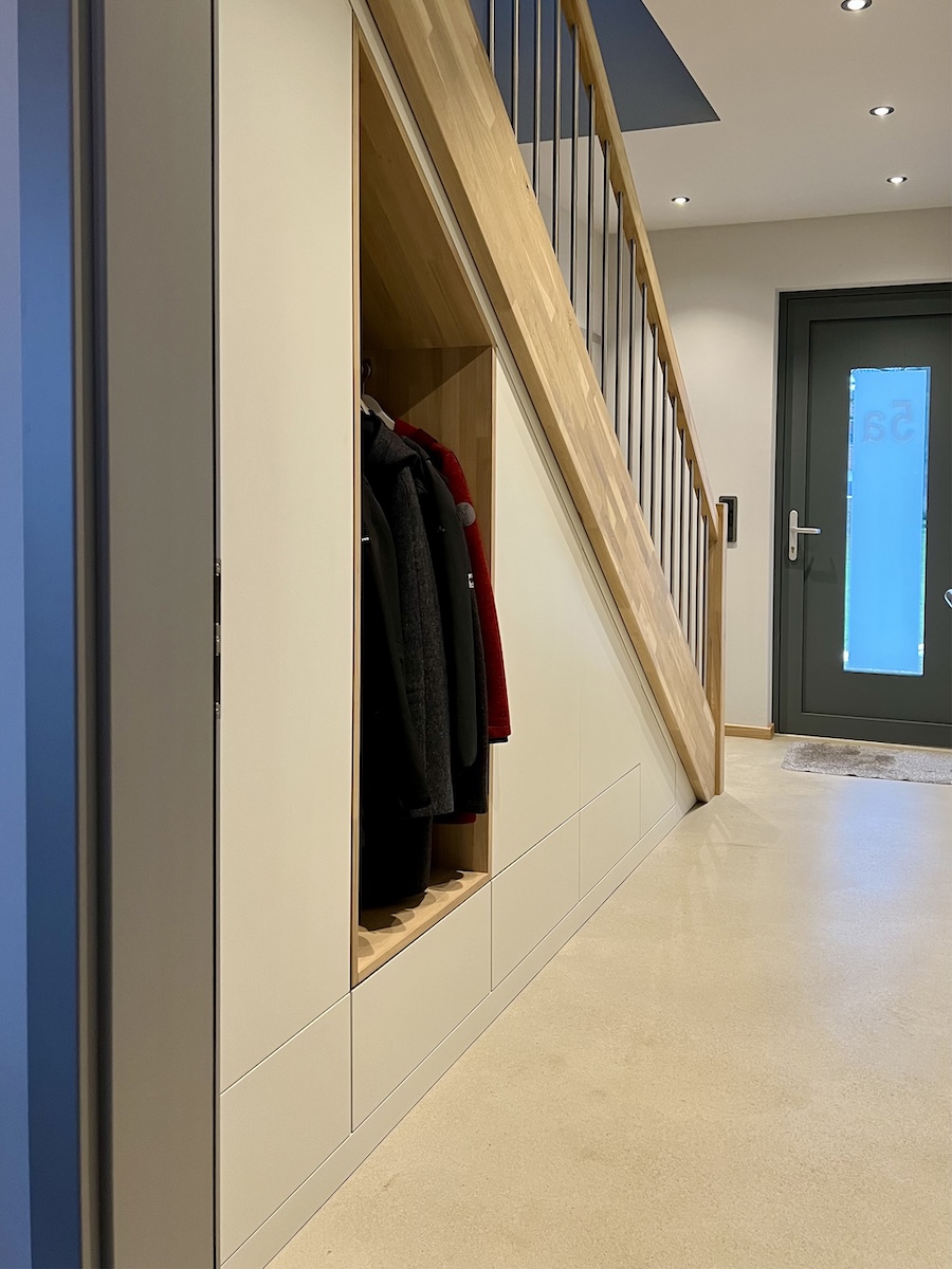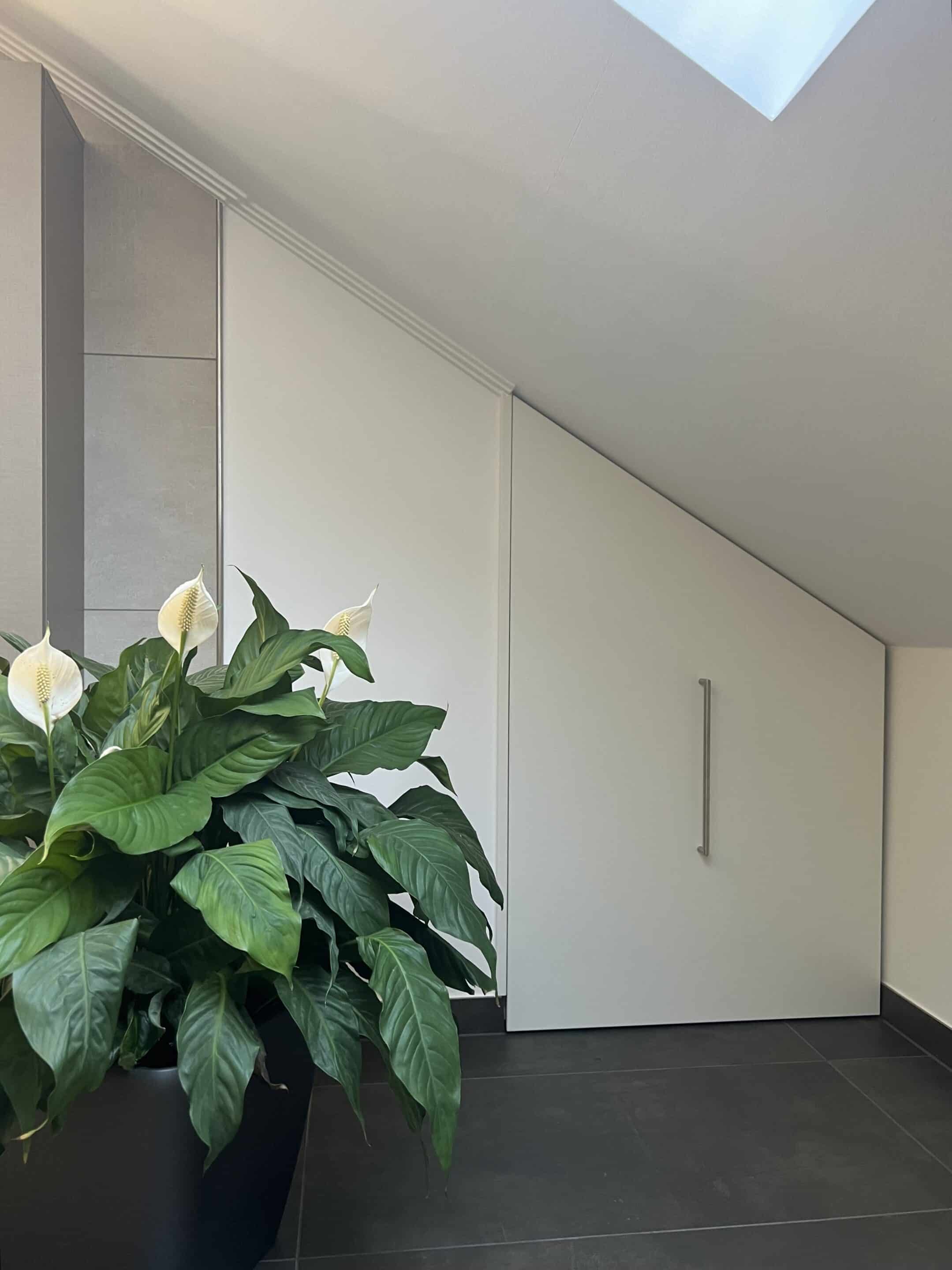 Unter Dachschrägen bleibt oft wertvoller Platz ungenutzt, weil Standardmöbel hier an ihre Grenzen stoßen. Mit einer passgenauen Lösung wird genau dieser Bereich vollständig erschlossen. Auch niedrige Zonen oder schwierige Übergänge werden sinnvoll integriert, sodass aus scheinbar „verlorenem Raum“ ein voll nutzbarer Stauraum entsteht.