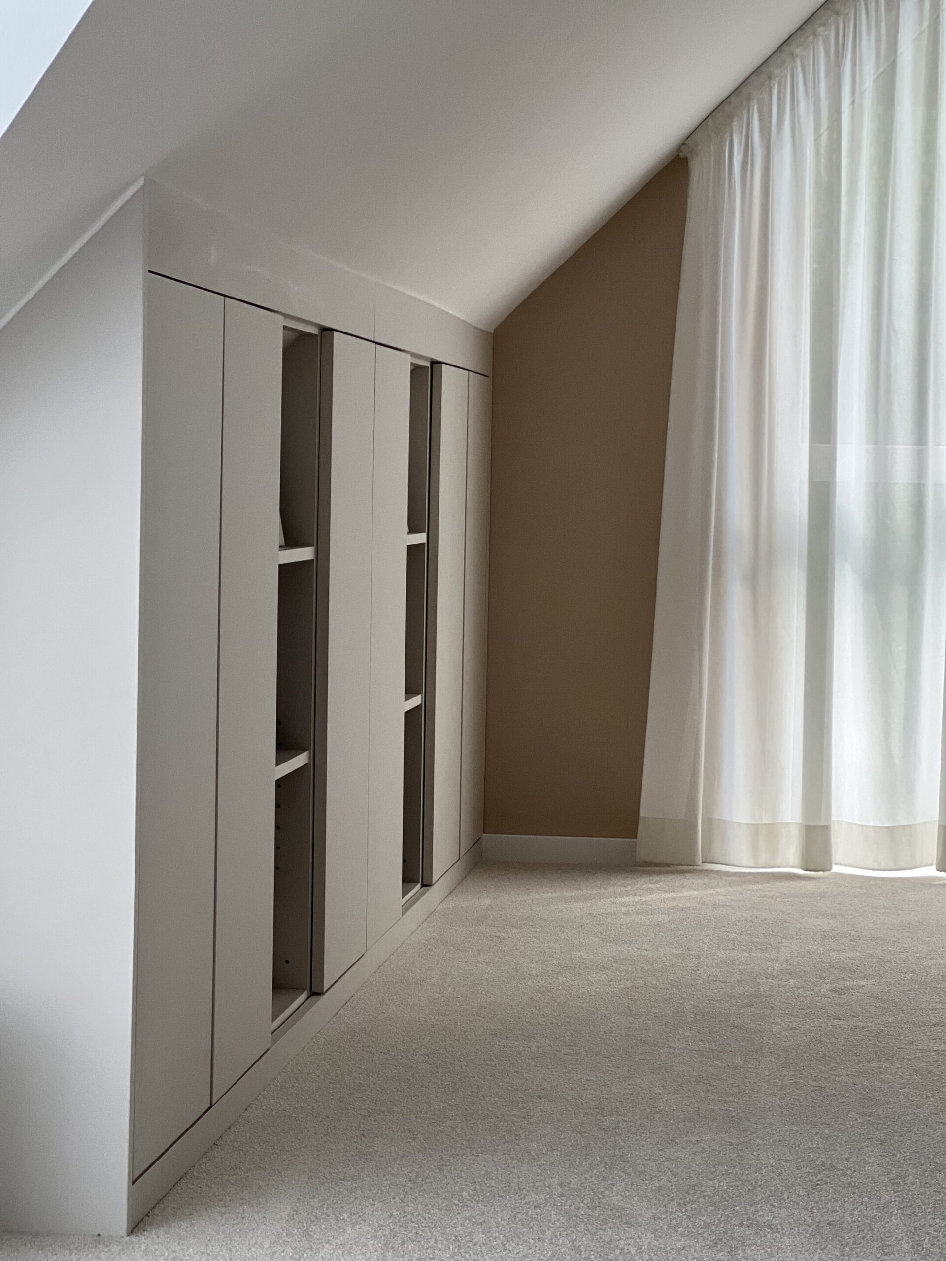 Eine durchdachte Lösung sorgt nicht nur für zusätzlichen Stauraum, sondern auch für eine klare Struktur im Raum. Offene, unruhige Bereiche unter der Schräge verschwinden und werden durch eine saubere, geschlossene Gestaltung ersetzt. Das Ergebnis ist ein aufgeräumtes Gesamtbild, das den Raum ruhiger, hochwertiger und deutlich strukturierter wirken lässt.
