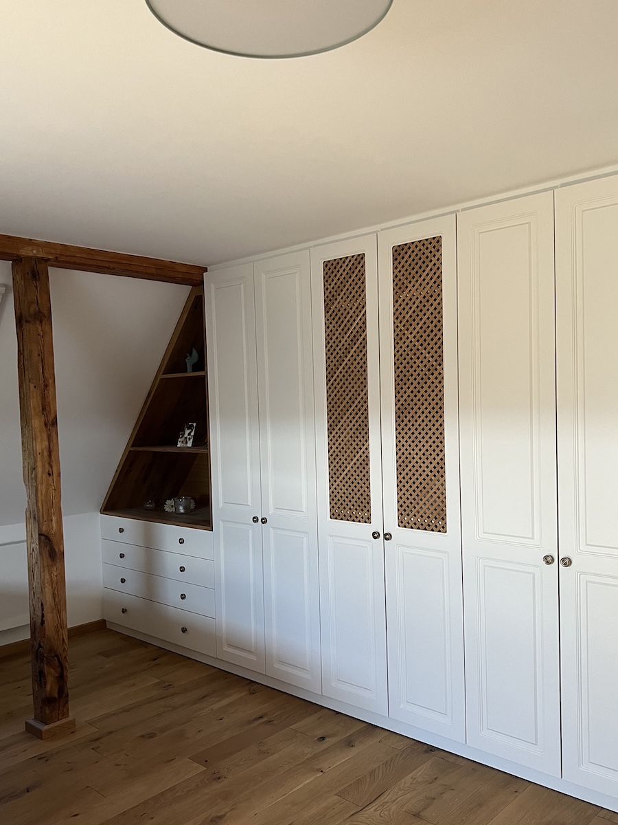 Gerade unter Dachschrägen ist eine saubere Planung entscheidend. Jeder Winkel, jede Höhe und jede Schräge muss genau berücksichtigt werden, damit am Ende nicht nur alles passt, sondern auch sinnvoll nutzbar ist. Genau hier liegt mein Anspruch: Lösungen zu entwickeln, die sich perfekt in den Raum einfügen und im Alltag überzeugen.